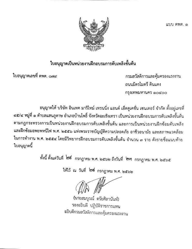ได้รับใบรับรองที่ออกโดย บริษัท อินเทค มาริไทม์ เทรนนิ่ง แอนด์ เอ็ดดูเคชั่น เซ็นเตอร์ จำกัด ได้รับการรับรองจากกรมสวัสดิการคุ้มครองแรงงาน ถูกต้องตามกฎหมาย